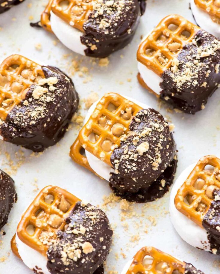 They combine salty pretzels with gooey marshmallows, graham crackers, melted dark chocolate, and creamy peanut butter.