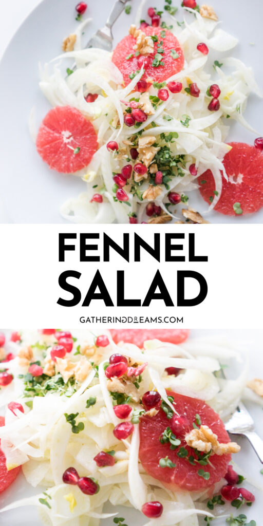 This festive and colorful fennel salad will brighten up any dull winter day. The combination of crisp and refreshing fennel, the sweetness of pomegranate, the tangy citrus notes of grapefruit with the crunchiness of walnuts give this salad a perfect balance of flavors and textures. Also a great addition to your holiday table!